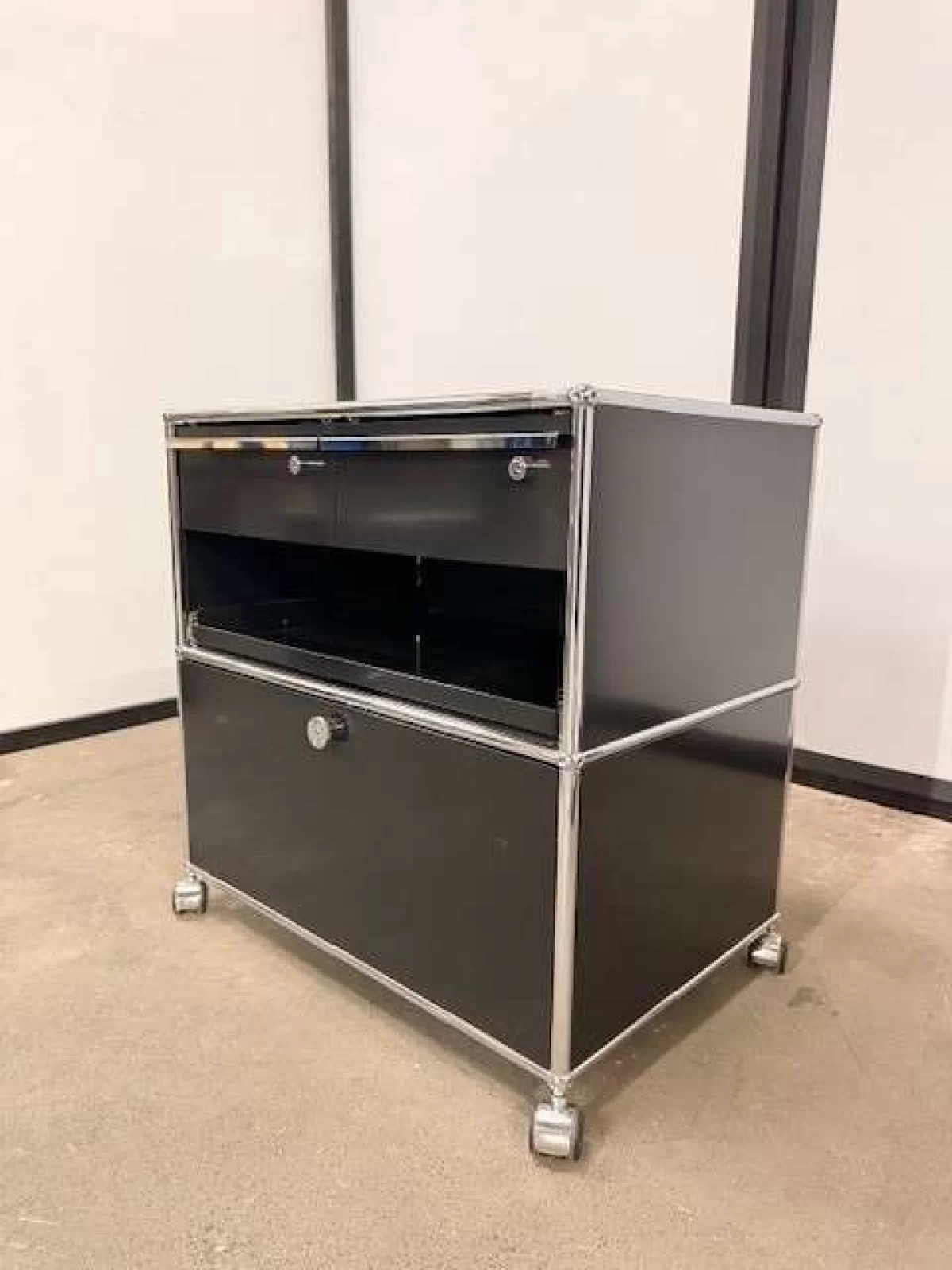 Verfügbar: 1 Artikelnummer: 493 Zustand: gebraucht Marke: USM Haller Abmessungen in cm: 777852 (BreiteHöheTiefe)